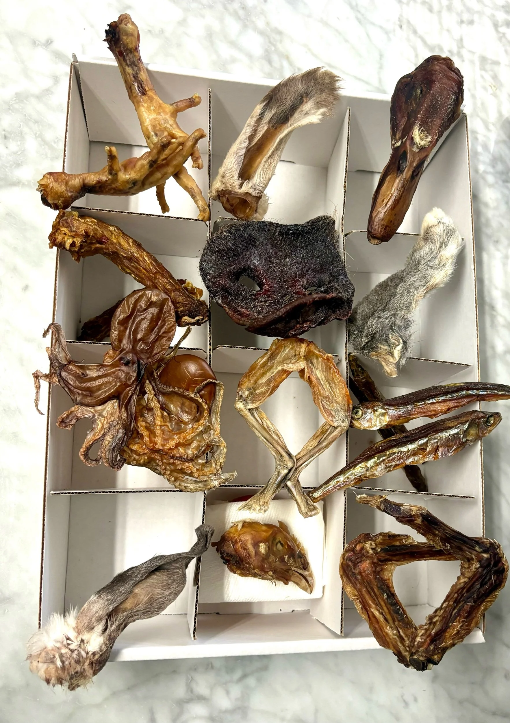 Includes: 2 chicken feet, 1 lamb ear, 1 duck head, 2 chicken necks, 1 pork snout, 1 rabbit foot, 2 octopus, 1 frog leg, 4-5 smelt, 1 rabbit ear, 1 chicken head, and 2 duck wings.